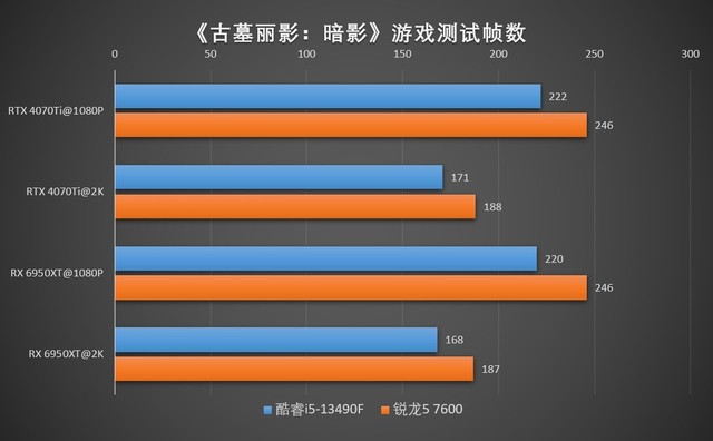 考虑到AMD和英伟达两边显卡的性能不同,我们分别搭建了RX 6950XT和RTX 4070Ti两个性能相近的平台,并进行了游戏的1080P和2K画质帧数测试,来看看这两款CPU的性能发挥如何。