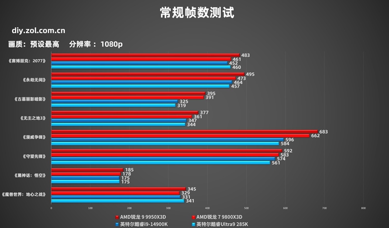 综合帧数来看,AMD 锐龙9 9950X3D就像是一个PRO MAX版的AMD 锐龙7 9800X3D,虽然两款处理器帧数表现上本身没有特别大的差距,但是AMD 锐龙9 9950X3D频率规格更高,帧数表现自然会更强,对比隔壁的两款旗舰则与AMD 锐龙7 9800X3D表现一样在游戏中帧数堪称降维打击,目前游戏优势极大。
