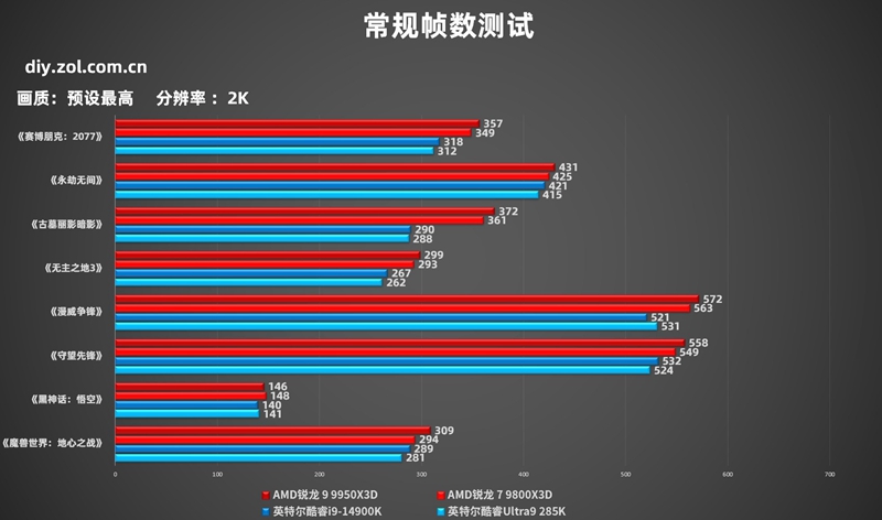 2K分辨率帧数表现与1080p类似,AMD 锐龙9 9950X3D帧数表现依旧大幅领先酷睿i9-14900和酷睿Ultra 9 285K,对比AMD 锐龙7 9800X3D除了《黑神话:悟空》被反超了两帧其余也要更强。