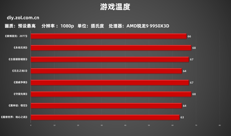 AMD 锐龙9 9950X3D温度表现也十分出色,玩这些游戏时没有上到70℃以上。因为从上一代锐龙7000X3D开始AMD就开始优化能耗比,因此这代锐龙9000的3D V-Cache缓存CCD进行了重新布局设计,目前来看卓有成效,在发挥最强的游戏帧数表现外还能将温度控制在十分健康的水平。