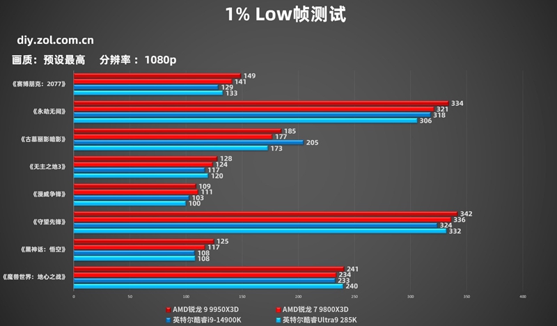 1% Low帧与上面常规帧数差异极大,感觉像没多帧生成一样,我们这里记录了1080p时几款游戏的1% Low帧表现。AMD 锐龙9 9950X3D的1% Low帧依旧十分亮眼,在1080p分辨率中,除了《古墓丽影:暗影》外,测试的其余游戏均要比i9-14900K和酷睿Ultra 9 285K强,在画面流畅度和稳定性方面,这款处理器表现优异。