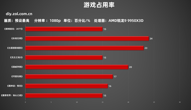 可以看到AMD 锐龙9 9950X3D在这8款游戏中没有占用率超过30%的时候,这是全大核心魅力时刻,拥有足够多的核心线程支撑处理器的多核负载,还有余地去进行后台操作而不会影响性能,直播串流这些工作就十分令人安心。
