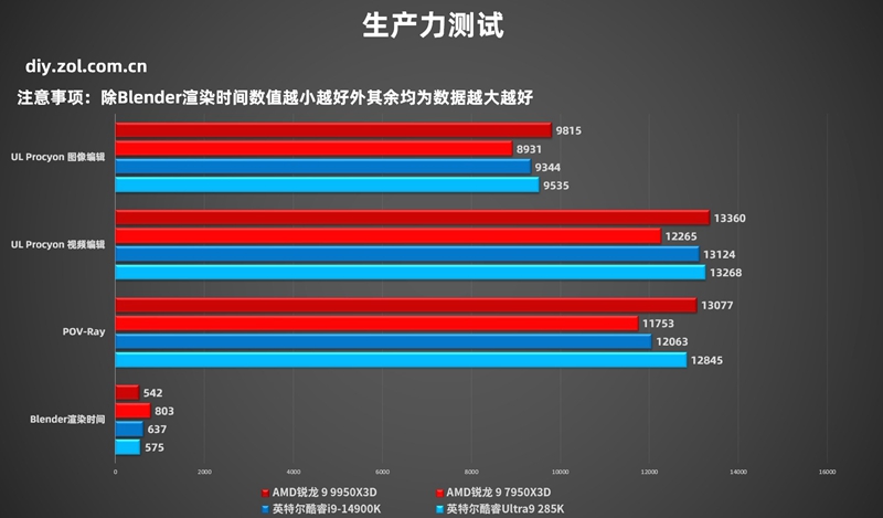 虽然有心理准备,但AMD 锐龙9 9950X3D在生产力方面的表现这次还是出乎了笔者意料,在基于Adobe Photoshop、Lightroom Classic、Adobe Premiere Pro的实测中,分数表现大幅超越上代AMD 锐龙9 7950X3D,同时也像游戏一样超越了隔壁i9-14900K和酷睿Ultra 9 285K,POV-Ray多核渲染和Blender也是如此。看来这次AMD果然是有备而来,做到了将处理器的生产力以及游戏融于一体,目前不管是游戏还是这些软件的内容创作都达到了业界领先水平。