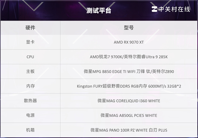 本次测试我们使用RX 9070XT这款AMD刚刚发布的显卡,正好顺便看一看目前新一代3A平台的表现。主板则搭配了微星MPG B850 EDGE TI WIFI 刀锋 钛,B850也是今年新出的芯片组,这款微星主板本身定位中高端,足以发挥出AMD 锐龙7 9700X的全部性能,在这次测试中,因为Ultra 9 285K毕竟是英特尔的新一代旗舰,所以我们还会开启AMD 锐龙7 9700X的105W性能模式。至于Ultra 9 285K我们也搭配了一款最新的Z890主板,同时BIOS采用了英特尔默认设置来保证平台稳定性。