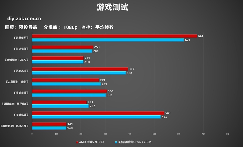 1080p分辨率中,AMD 锐龙7 9700X在这9款游戏中有7款游戏占据了帧数优势,其中绝大部分是网络游戏,尤其是《无畏契约》这种帧数优势极大,目前锐龙9000处理器确实整体在网络游戏的表现也确实更强势一些。