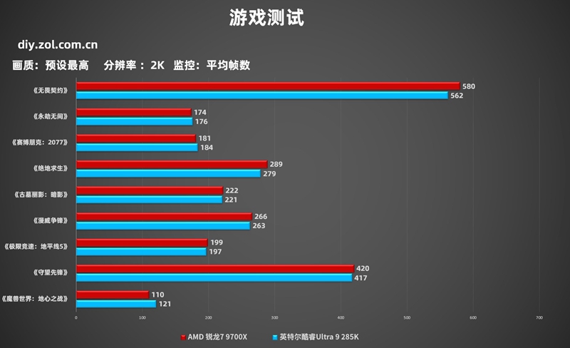 2K分辨率中,AMD 锐龙7 9700X这次帧数也领先了6款游戏,主要帧数优势与1080p一样还是以网游为主,不过古墓和地平线也实现了反超。