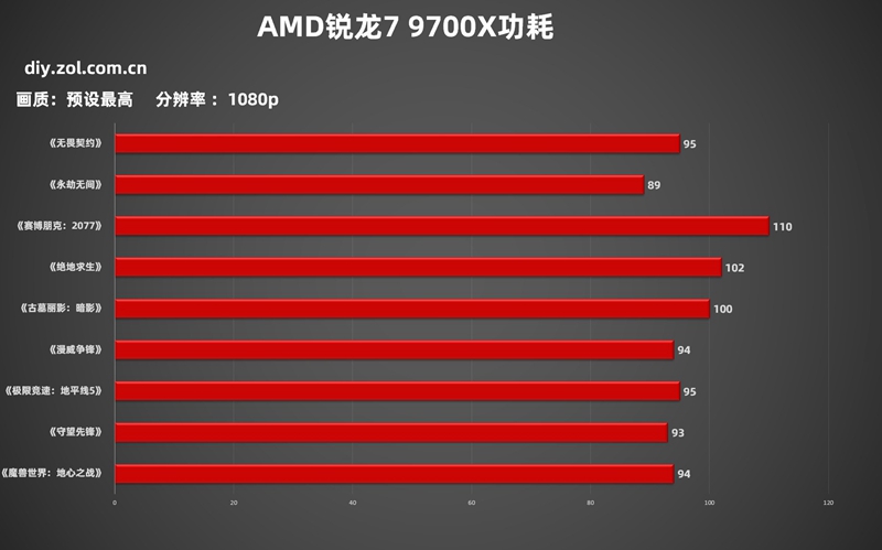 可以看到目前AMD 锐龙7 9700X的8核心16线程应对现在的这些游戏还是很有余力的,最吃占用率的是《赛博朋克:2077》,达到了87%,不过即使占用率如此高,AMD 锐龙7 9700X在这款游戏中的平均温度也只有74℃,说明这代AMD 锐龙9000的温度控制确实非常好,就像我们开头说的高压还能保持冷静运行。同时我们还记录了功耗,看一看解锁了105W功耗后AMD 锐龙7 9700X实际在游戏中的表现。