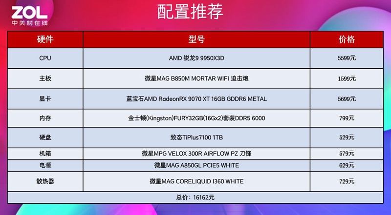 AMD 锐龙9 9950X3D无愧于当下最强消费级游戏处理器的名头,这款CPU在游戏表现上无可挑剔,不仅能够助力玩家体验到千帧的游戏画面,在王牌对王牌的游戏实测对比中,帧数也大幅领先对手旗舰酷睿Ultra 9 285K,对于追求游戏体验的玩家们,预算充足值得优先考虑。我们下面也为大家攒出了一套AMD 锐龙9 9950X3D装机平台作为参考。