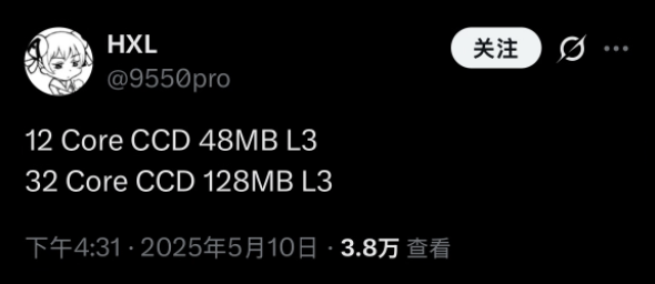 爆料人 HXL 于5月10日在 X 平台透露,Zen6架构处理器每个 CCD 的核心数量将增至12个,而当前 Zen5架构 Ryzen9系列处理器采用的是每 CCD8核心的设计。