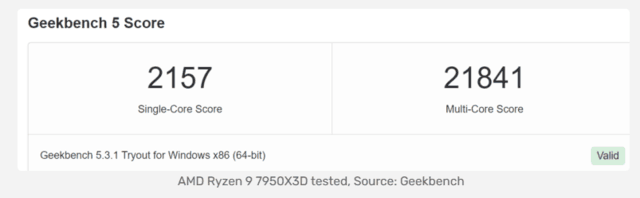 但是,仅仅出于明确的原因,7950X3D在单核测试中得分为2157分,在多核测试中得分为21841分。它是Geekbench的V5版本,所以分数可能会因软件更新而有所不同。
