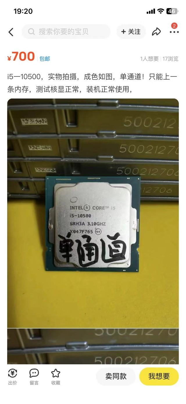 例如我们搜索10代酷睿i5-10500这款CPU,就会有很多种结果,根据卖价的不同,还会有单通道版、无核显版、正显版等,这都是什么情况?先说无核显版,指的并不是带有F后缀的产品,而是标准的10500,但是核显无法输出显示信号。由于CPU是高度集成的,因此所谓无核显版,当然就是核显坏了呀。