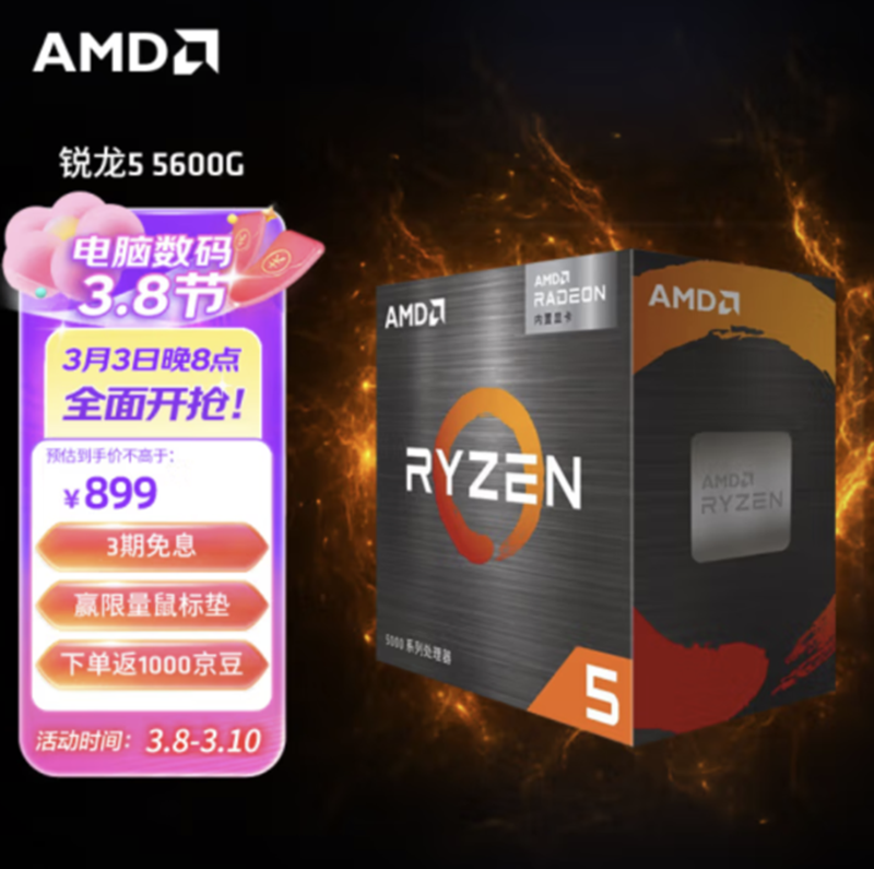 锐龙5 5600G的性能其实比上面的锐龙5 5500还要强,并且自带核显,拥有6核心12线程,不需要独立显卡也可以直接点亮开机,对商用办公和家庭娱乐的用户非常友好,首发时性价比就极高,目前已经降到了899元,有需求可入。