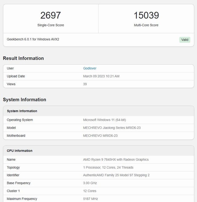 测试中使用的机型为蛟龙MRID6-23,可能是即将上市的蛟龙16。预计蛟龙16可能会配备锐龙9 7845HX处理器,但其成本会相对较高。虽然笔记本市场主打性价比,但主打性价比的型号通常会配备老款或马甲处理器,而锐龙9 7845HX作为AMD移动端的最新型号之一,规模十分强悍,估计售价不便宜。该处理器的性能表现已经引起了广泛关注,我们期待它的上市表现。