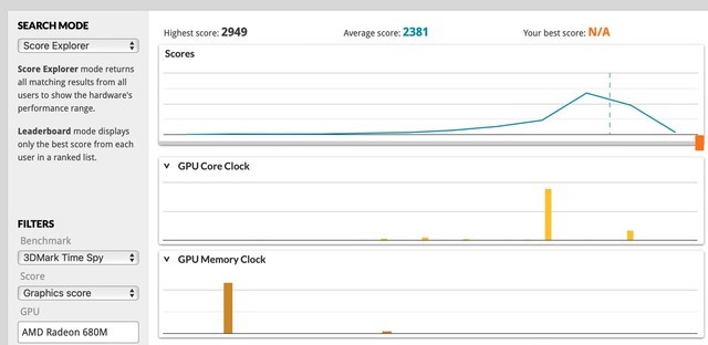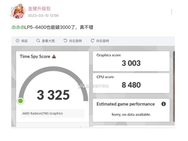 据消息称,AMD最新的Radeon 780M核显配合LPDDR5-6400内存的3DMarkTimeSpy显卡分数已经突破了3000分,相较于上一代的Radeon 680M,其平均分数为2381分,最高分数可达2949分。