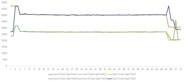 近日,网络上流出了Phoenix ES APU的时钟频率运行图表,显示了这款6核心处理器采用2+4配置,其中包括两个Zen 4性能核心和四个Zen 4c效率核心。其中,性能核心Core 0和Core 5的时钟频率在4.0-5.0 GHz之间,平均值为4.2-4.3 GHz,而其他四个效率核心的运行范围在2.5-4.0 GHz之间,平均时钟频率略低于3.0 GHz。