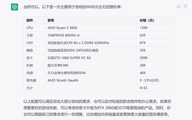 我们让ChatGPT给出一份6000元主要用于游戏的攒机单,好消息是整体的配置还算合理,但坏消息是其数据库只到2021年9月,部分配件信息会比较旧跟不上时代。