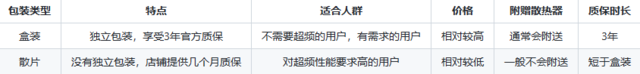 盒装的CPU是独立包装的单个产品,享受官方3年质保;而散片则没有独立包装,消费者买到手的CPU都是商家后加的一个塑料壳,一般只有店铺提供几个月质保。散片价格较便宜,但也有其弊端:每颗CPU的超频性能有所差异,因此购买散片基本上都是被挑剩下的。