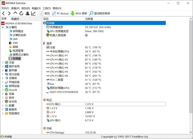 首先,你需要在电脑中安装aida 64这款软件,直接去官网下载,免费的试用版也不影响测试,在软件中选择计算机-传感器,在温度这栏就可以看到所有硬件的具体温度了,点击折线图的图标可以看到硬件的温度走势,帮助我们进行判断。