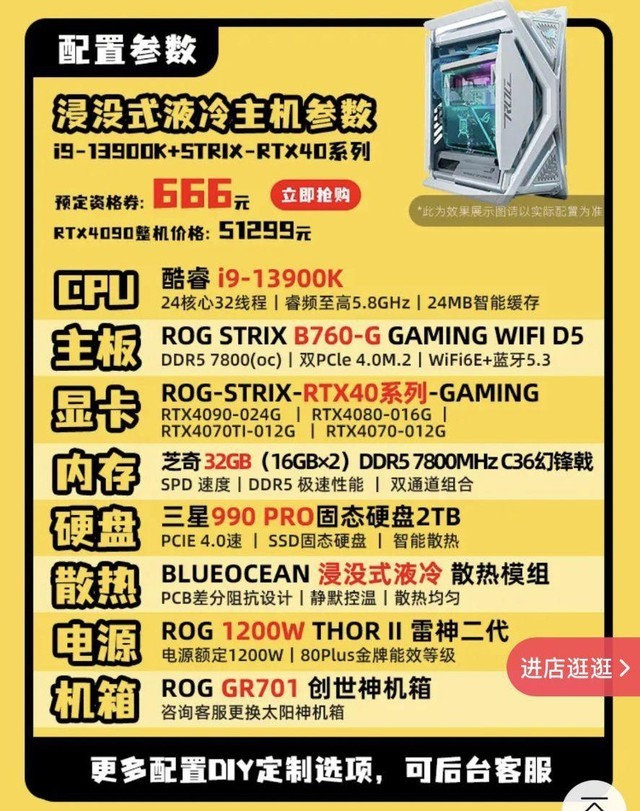 电源说实话没必要上1200W,13900K配RTX 4090用1000W电源就够,这都直接安排浸没液冷了,后续基本上也不会升级了,不用担心电源的问题。另外机箱用ROG也是真的信仰,如果不追求华硕的话用600块钱的机箱效果也差不多。