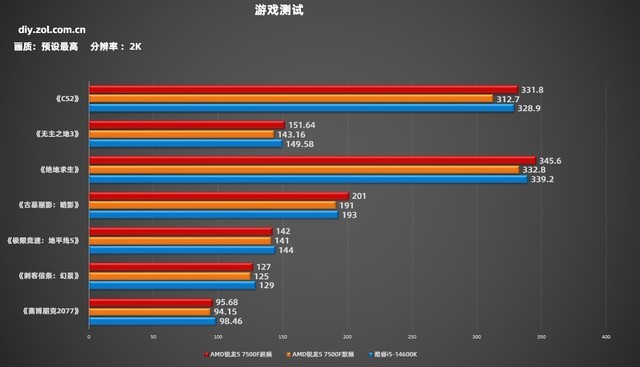 2K分辨率的超频在各个方面都能明显提升帧数,这一趋势与1080p分辨率相似。令人惊喜的是,即使在《CS2》、《无主之地3》、《绝地求生》和《古墓丽影:暗影》这四款游戏中,AMD 锐龙5 7500F依旧能超过酷睿i5-14600K的帧数表现。而在剩下的三款3A游戏中,酷睿i5-14600K的性能则更加出色。综上所述,2K分辨率的超频对提升帧数有着显著的影响,而AMD 锐龙5 7500F和酷睿i5-14600K在不同游戏中的表现也有所不同。
