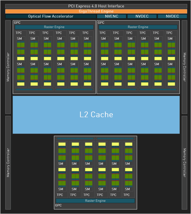 如果在L1缓存中找不到内核计算所需的数据,GPU将在L2数据缓存中寻找。这个显存系统位于GPU芯片上,并通过一个非常高速的横梁系统连接到所有的GPC(图形处理集群),每个GPC包括多个SM。如果在L2缓存中找到了信息,那么GPU就挑出这些数据并将其放入内核。