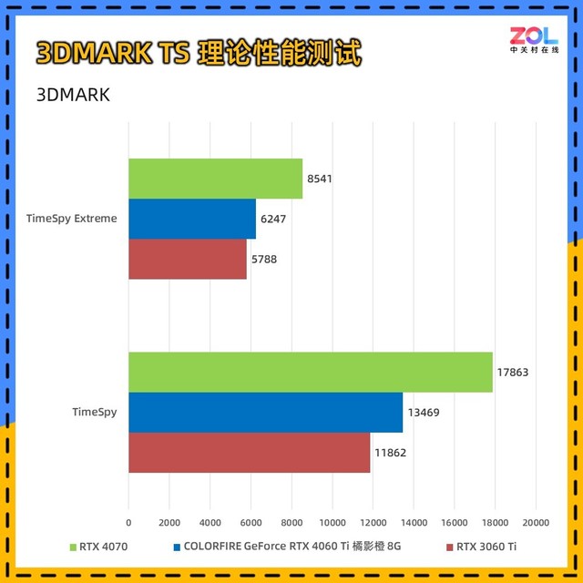 而在针对DX12环境下的Time Spy和Time Spy Extreme测试中,七彩虹 RTX4060Ti 橘影橙 8GB相较RTX 3060 Ti的提升分别为:TS提升14%;TSE提升8%,综合约为11%。