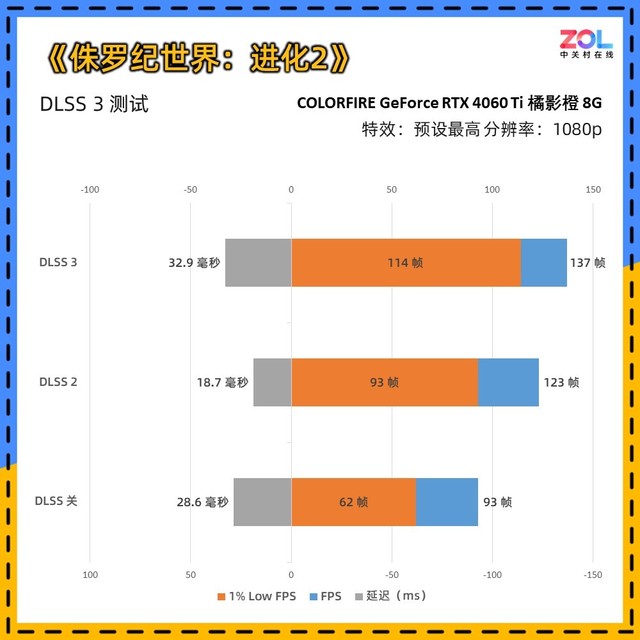《暗影火炬城》在开启光追后对于性能要求明显提高。其中七彩虹 RTX4060Ti 橘影橙 8GB显卡开启DLSS 3相比DLSS关的帧数提升了50%,DLSS 2的提升则达到了36%。