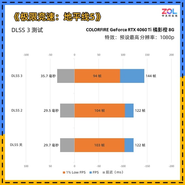 《极限竞速:地平线5》是最新加入DLSS 3的游戏,对于显卡优化十分到位,在1080p分辨率下,游戏帧数受到CPU瓶颈限制,所以即便七彩虹 RTX4060Ti 橘影橙 8GB显卡开启DLSS 2,帧数依然相同。而在开启DLSS 3后,显卡仍有发挥空间,让帧数能够再提升18%。