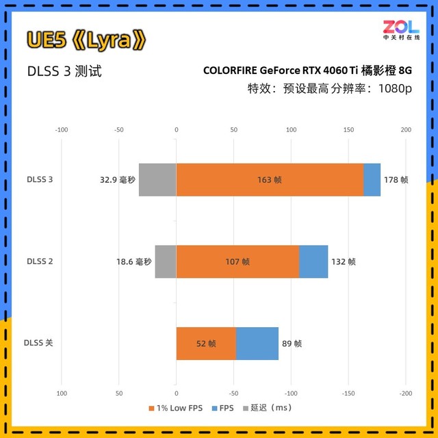 Lyra是典型显卡要求高过CPU要求的游戏测试demo,其中七彩虹 RTX4060Ti 橘影橙 8GB在DLSS关的情况下,即便1080p分辨率也只有89帧,而开启DLSS 3后,帧数直接提升1倍。