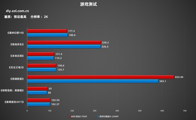 2K分辨率整体趋势与1080p一致,因为拥有超大的缓存,AMD 锐龙5 7500F在《英雄联盟》这种老牌网游中帧数表现远超英特尔酷睿i5-13490F,除了《最终幻想14》外,其他6款游戏帧数表现更高。