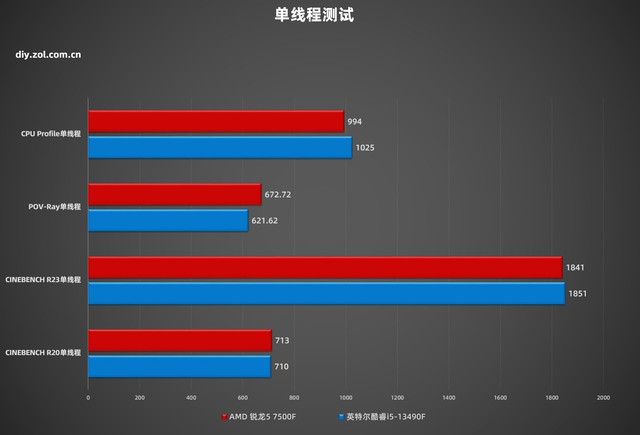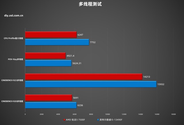 在单线测试中,AMD 锐龙5 7500F除了R23低于酷睿i5-13400F外,其余三项测试分数都要更高,毕竟AMD 锐龙5 7500F拥有更高的频率表现,单核性能发挥理应更好。多线程同样没有悬念,酷睿i5-13400F大小核心设计拥有天然的核心线程数优势,分数也要更好。