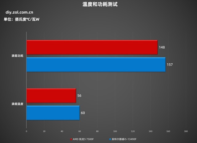 整机功耗和温度方面,AMD 锐龙5 7500F也做的十分优秀,满载整机功耗在148W左右,对比英特尔酷睿i5-13490F功耗和温度都控制的更出色,而这种功耗和温度表现说明AMD 锐龙5 7500F盒装自带的Wraith Stealth幽灵散热器是完全能满足用户默频游戏以及日常使用需求。