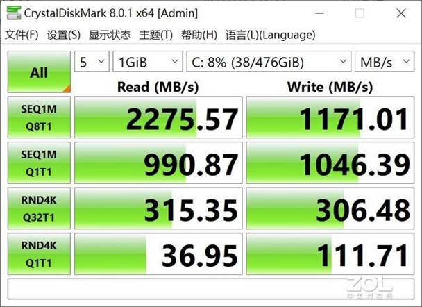 固态硬盘是来自三星的PM991,笔者这款是512GB的版本,读写速度表现如下,最高读取速度2200MB/s,连续写入1100 MB/s,性能还是很强悍的。