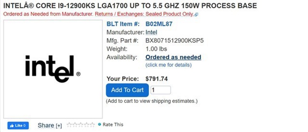 英特尔 i9-12900KS处理器现在开始出现在零售商处,Shop BLT 的盒装零售处理器售价为 791 美元,纯芯片 OEM 部件售价为 780 美元。