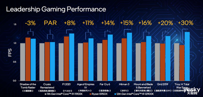 根据英特尔公布的数据显示,在测试的30余款游戏中,英特尔 i9-12900K能够在大多数游戏中领先锐龙95950X,其中《超级房车赛2019》领先达到了20%,《全面战争传奇特洛伊》领先多达30%。因此,继11代酷睿i9-11900K之后,凭借英特尔 i9-12900K,英特尔仍旧把最强游戏处理器的称号攥在手里。