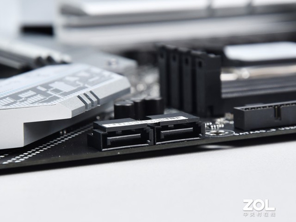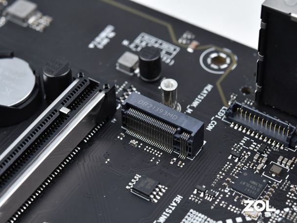 这款主板板载3个M.2插槽,全部支持PCIe 4.0,并且搭载金属散热片,使用免螺丝的M.2便捷卡扣安装设计。最上方的M.2插槽不仅直连CPU,还支持全尺寸M.2。