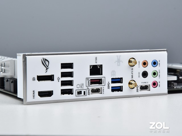 I/O区域,华硕 B660-A GAMING WIFI D4 吹雪主板预装了颜值超高的一体化白色I/O背板,提供一个HDMI接口一个DP接口,4个USB 2.0接口,2个USB 3.2 Gen1 Type A接口,一个USB 3.2 Gen1 Type C接口,一个USB 3.2 Gen2 Type A接口,这个接口搭配旁边的BIOS FlashBcak按钮,可以免CPU、内存升级BIOS。此外还有一个USB 3.2 Gen2 Type C接口,一个2.5G有线网口,一个WiFi 6天线接口,以及5个音频接口。