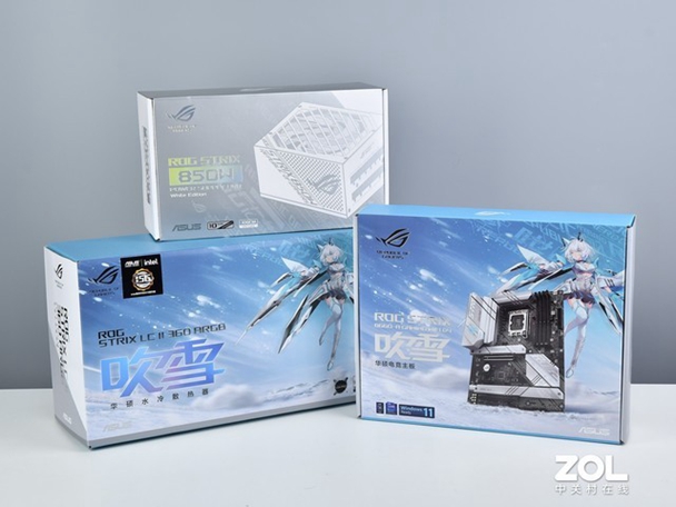 这次我们不仅使用了吹雪新品主板,还搭载ROG STRIX 850W电源以及ROG STRIX LC Ⅱ 360 ARGB散热器三件套,全部都是白色外观,非常适合打造时尚高颜值的白色主机。