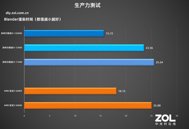 生产力测试比较有趣,酷睿i5-12400在Blender和POV-Ray上表现都要优于锐龙5 5600G,而X264和X265被锐龙5 5600G反超。这项测试除了考验处理器本身性能外,也需要英特尔和AMD的生态优化,在这方面,目前两者都有自己的优势领域。