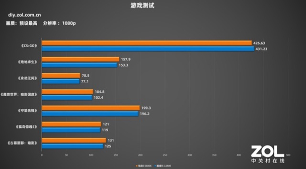首先是1080p分辨率,AMD 锐龙5 5600X在这个分辨率中除了《CS:GO》外,其余游戏均有更高的帧数表现,本身AMD 锐龙5 5600X频率就比英特尔英特尔 i5-12400高,加上更大的三级缓存设计,,所以AMD 锐龙5 5600X帧数测试优势明显。