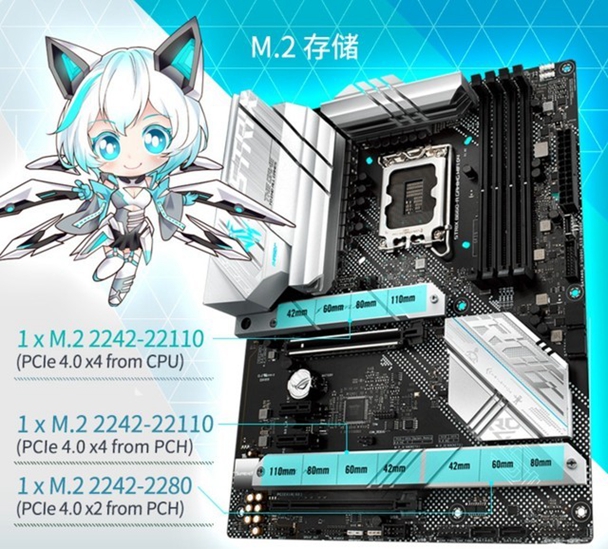 PCIe 5.0则不用担心,是向下兼容的,也就是B660主板即使支持PCIe 5.0也不用担心现在的显卡或者M.2用不了。甚至像华硕 B660-A GAMING WIFI D4吹雪这样较为高端B660都有3个PCIe 4.0 M.2插槽,比上代只有一条PCIe4.0 M.2插槽的B560主板强太多了,这些M.2插槽在安全时支持华硕M.2便捷卡扣设计,不用螺丝就能做到轻松拆装M.2固态。同时华硕部分B660主板还支持PCIe 5.0,提供一根满带宽的PCIe 5.0x16显卡插槽,为即将上市的PCIe 5.0产品做准备。