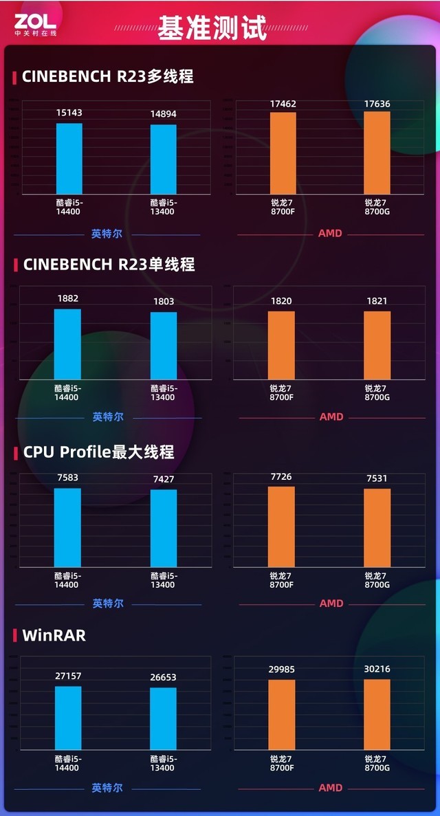 首先来看一下针对AMD锐龙7 8700F处理器的基准测试性能,在基准测试中,我们使用了CPU Profile、CINEBENCH R23以及WinRAR进行了测试。