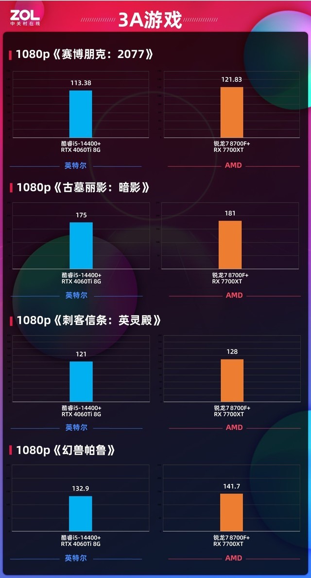 游戏性能现在是AMD处理器的一大优势,我们这次主要针对最吃处理器的1080p分辨率进行测试,AMD锐龙7 8700F平台搭配的是RX 7700XT这款中端RX 7000系列显卡,对比酷睿i5-14400+RTX 4060Ti 8G这套组合,看一看AMD锐龙7 8700F组成的3A平台,对比同级别的对手有怎样的表现。