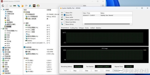 经过了40分钟的拷机测试,AMD 锐龙7 8700F处理器的温度大概在80℃上下,这个温度表现非常健康,作为一款8核心16线程的处理器,使用风冷就能完全压住,说明其温度控制非常好。而此时我们记录AMD 锐龙7 8700F整机的功耗在162W左右,对比隔壁酷睿i5-14400+RTX 4060Ti 8G显卡平台单拷FPU 168W的功耗还要低一些,在能效上,这套3A平台也具有优势。