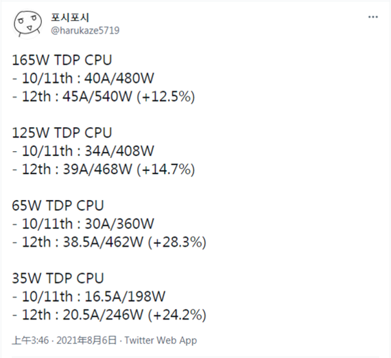 英特尔12代Alder Lake芯片将采用全新的“Intel 7”(之前称作10nmN80H58VcSuperFin)工艺结点制造。与使用多年的14nm工艺较之,“Intel 7”工艺结点的不断进步相当显著。但FCPowerup分享的最新供电规格表可以看到,12代Alder Lake-S台式机处理器的功耗要依然在增长。至于AMD的Zen 4商品组合,比英特尔10nm ESF(即Intel7)更一流的三星电子5nm工艺,有望在未来一段时间内继续维持领先水平。