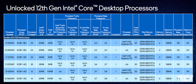 首批亮相的六款第12代英特尔酷睿台式机处理器SKU型号列表如下