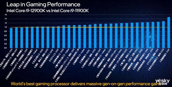 在性能方面英特尔也公布了一些对比成绩,例如英特尔 i9-12900K相比上代酷睿i9-11900K,运行《英雄联盟》性能提升超过40%,《杀手3达特穆尔》提升约30%,《全面战争三国》提升超过20%。英特尔 i9-12900K与AMD 锐龙9 5950X相比,性能最多提升也达到了30%。