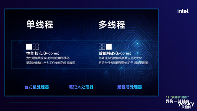 第12代英特尔酷睿处理器在x86架构上采取了一类革命性的方案,也就是混和体系结构。有两种的CPU核心,一类是性能核,一类是节能核。刚刚听到这个概念时,第一想到的就是手机上一直在使用的big.LLTTLE大小不一核架构,但是英特尔则特意强调,这和智能化手机上现代的big.LITTLE大小不一核架构截然不同,因为大小不一核里的小核是为了节能省电,12代酷睿里的E核则是为了强化多核性能,单纯上看它的性能依然是十分高的。