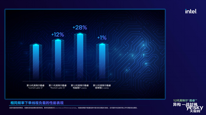 关于两者的性能方面,英特尔在公布会中提到,崭新的 Performance Cores 和 Efficient Cores 的性能水准,在有源指令和数据的测试中,Performance Cores 对比10代的 Comet Lake S 有 28%的性能提高,对比11代的Rocket Lake有19%的性能提高。看一下Efficient Cores的性能整体表现,Comet Lake使用了Sky Lake这一经典架构,在数代产品中也都使用了这样的架构。从图表中可以看到,捷伊Efficient Cores在性能整体表现上已经可以相媲美Sky Lake的架构水准。