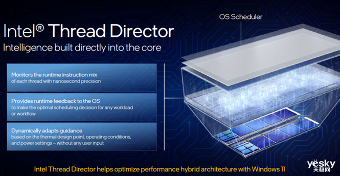 英特尔还模拟了英特尔硬件线程调度器(Intel Thread Director)的工作语义。可以帮助作业系统实现线程的崭新的调度制度,有毫秒级别的Runtimex86的监视,另外具备了Runtime的反应制度,可以将指令和虚拟机运行状况,及时反馈给作业系统。还有调度手册会根据散热、操作状况,以及功率设定,动态地去提供调度手册。